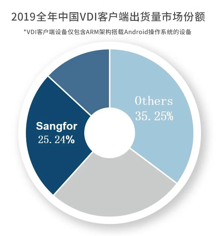 近日,最新发布的《IDC 2019年中国VDI客户端市场跟踪报告》(以下简称《报告》)显示,2019年全年中国VDI客户端市场总出货量增至100.7万台,同比增长2.9%。其中,VDI客户端设备仅包含ARM架构搭载Android操作系统的设备。深信服持续保持逐年快速增长的态势,2019年VDI客户端出货量为25.4万台,以25.24%的市场份额蝉联第二,并与第一市场份额仅相差1.16个百分点。
